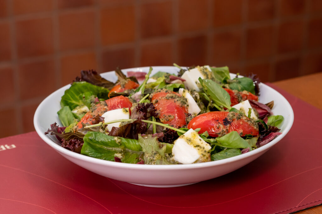Folhas frescas da horta, com muçarela de búfala do Seu Joaquim, tomate cereja confitado. Acompanha molho pesto de manjericão artesanal.
