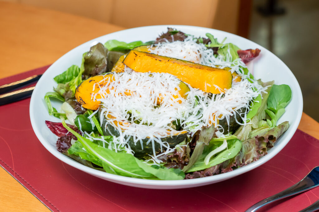 Folhas frescas da horta, com lascas de queijo de cabra e fatias de abóboras brasiadas.