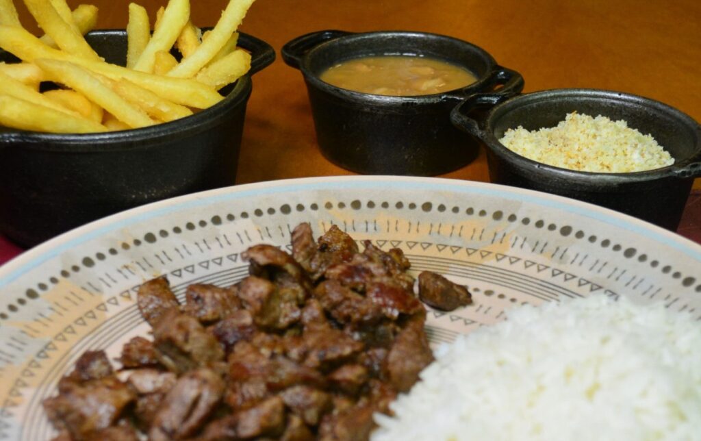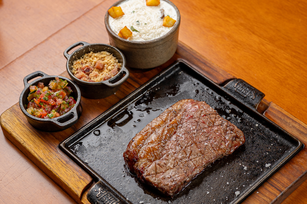 Os cortes de carnes acompanham arroz branco ou arroz brasido, farofa de bacon e vinagrete da terra.