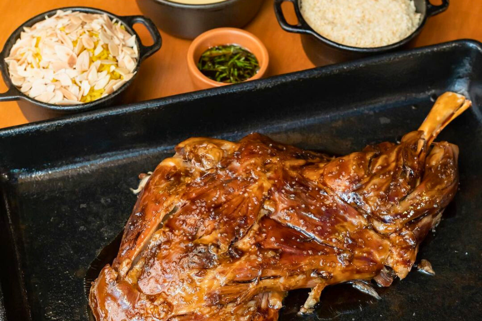 Paleta assada a baixa temperatura e prensada, acompanha aligot, arroz de açafrão e amêndoas e mel de hortelã.
