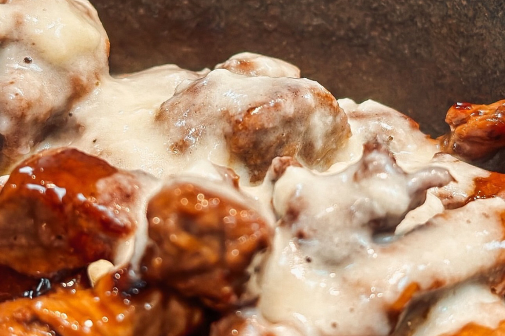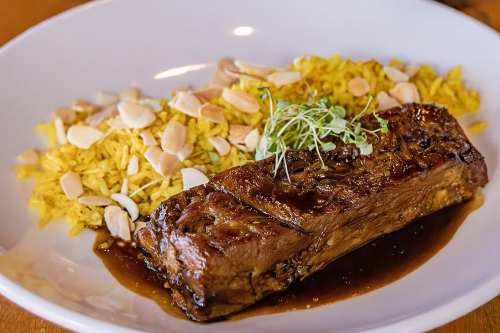 Brisket Black Angus super macios, assados lentamente com ervas finas, e levemente defumados. Acompanha delicioso arroz caldoso com brisket desfiado e farofa crocante.