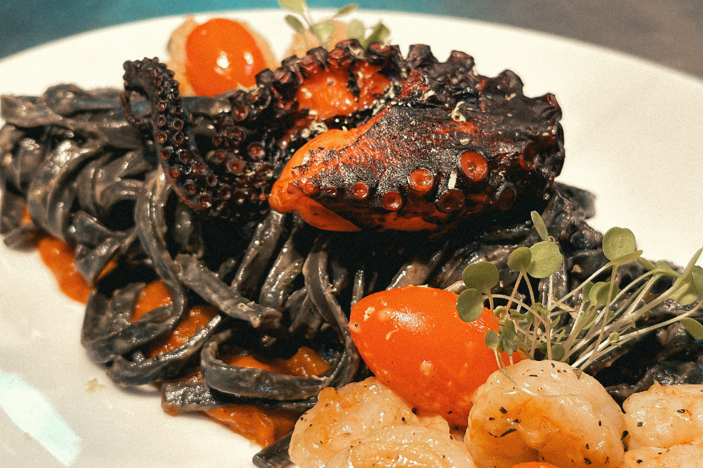 Massa feita com tinta de lula, camarão e polvo grelhado