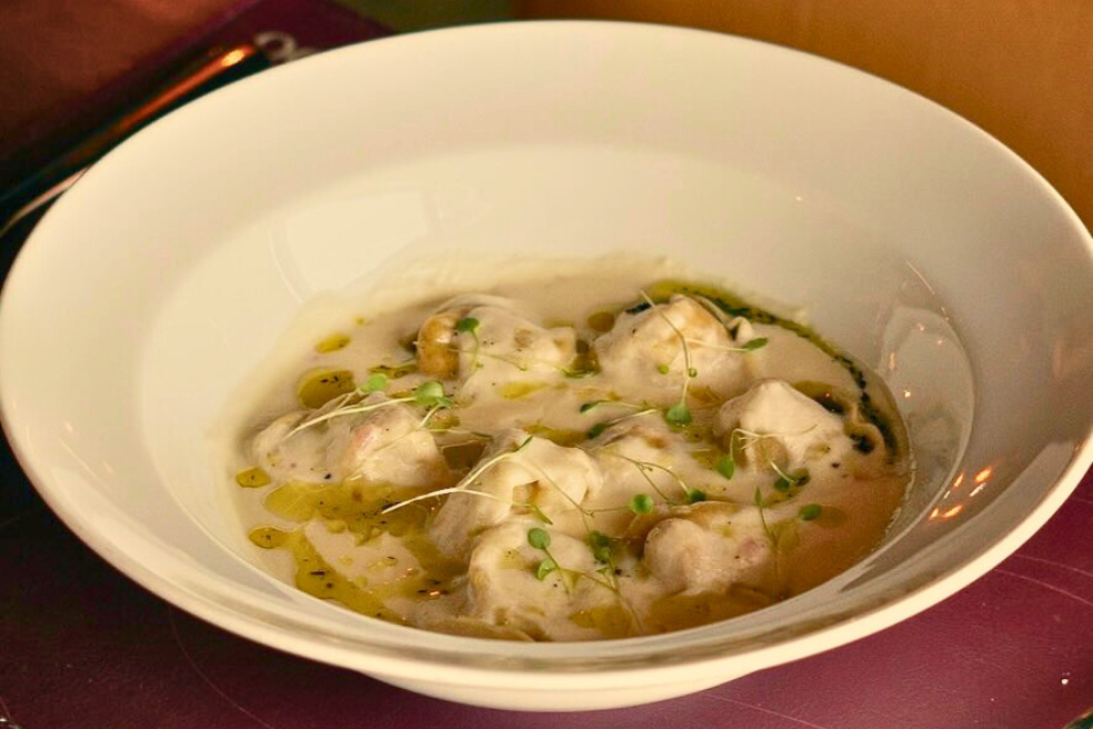 Massa artesanal recheado com salmão defumado com molho de limão siciliano e crocante de parmesão e castanhas.