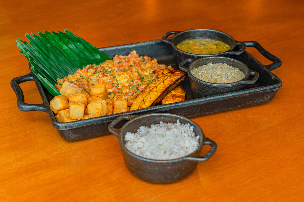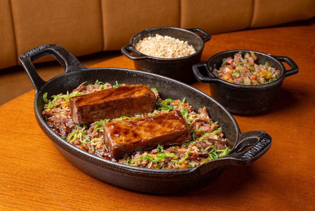 Assado e finalizado com salsa quente de tomate. Acompanha pirão Brasido, arroz branco, farofa de manteiga, banana da terra caramelizada e cubos de mandioca crocante.