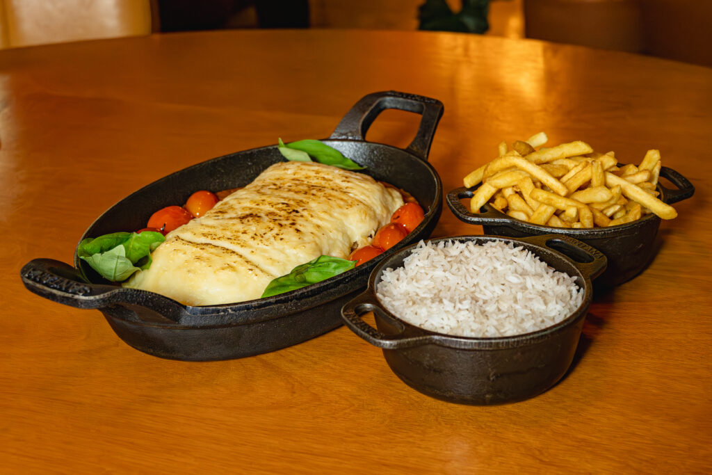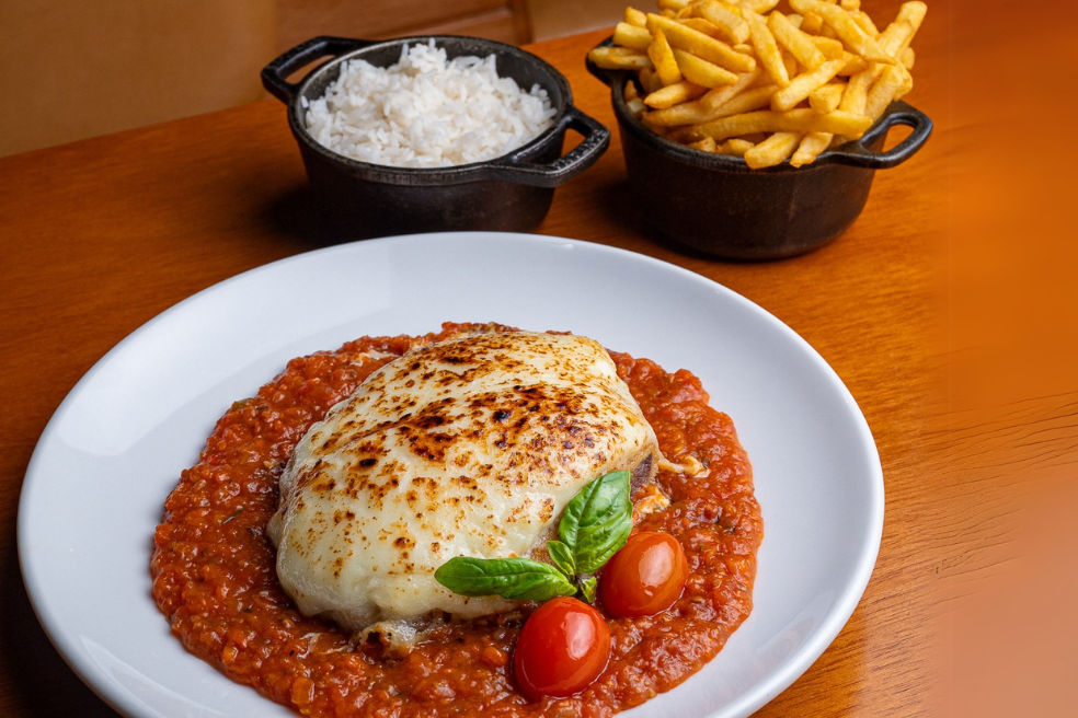 Filé mignon Black Angus preparado com crosta de farinha panko, cobertura especial com creme de queijo e generosa muçarela de búfala do Seu Joaquim, finalizado no forno e servido com molho de tomate artesanal. Acompanha batatas fritas ou laminadas e arroz branco.